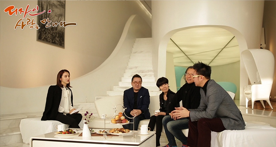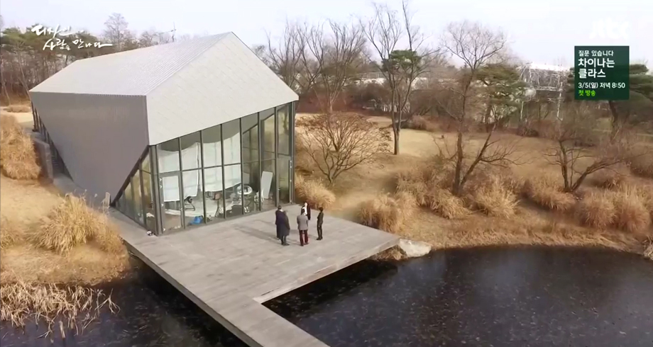 마임비전빌리지의 잔잔한 호수 물결처럼 고요한 겨울 풍경 속에서 배우 한혜진과 김영세, 배형민, 손정완, 송인호 디자이너가 드라마 하우스 창을 통해 들어오는 따뜻한 햇살을 맞으며 사람을 위한 디자인을 이야기 나누는 모습이 담긴 JTBC 특집다큐 <디자인, 사람을 만나다>